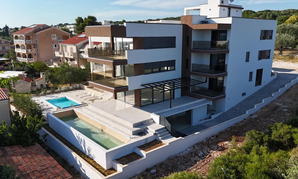 Na prodaju je luksuzan apartman u prizemlju moderne zgrade u mirnom i atraktivnom dijelu Kožina, udaljen svega 80 metara od mora. Apartman S1 prostire se preko cijele etaže, s neto stambenom površinom od 227 m², dok ukupna površina s pripadajućim dvorištem iznosi 404 m².