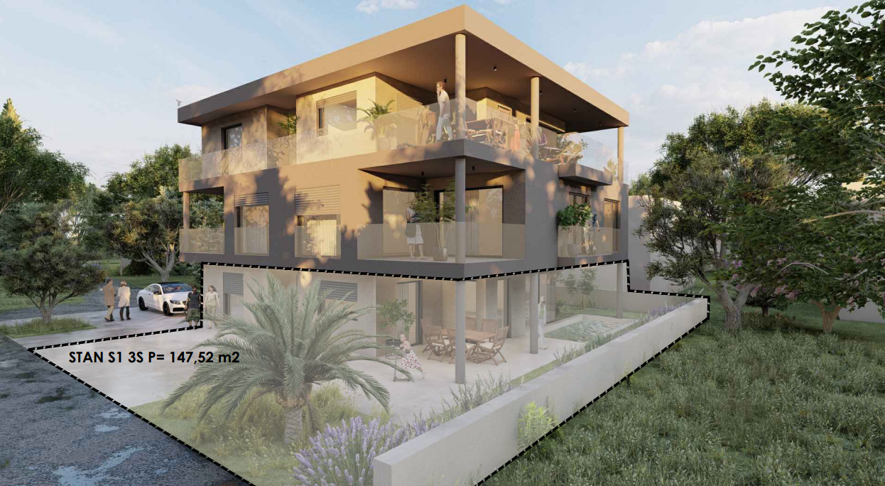 Na jednoj od najprestižnijih i najpoželjnijih lokacija južne strane otoka Vira, svega 100 metara od kristalno čistog mora i očaravajuće plaže, smješten je ovaj ekskluzivan trosoban stan u prizemlju suvremene, arhitektonski profinjene zgrade s liftom. Ova vrhunska nekretnina ukupne površine 147,52 m² utjelovljuje savršen sklad luksuza, elegancije i funkcionalnog dizajna, pružajući idealan ambijent za život uz more.