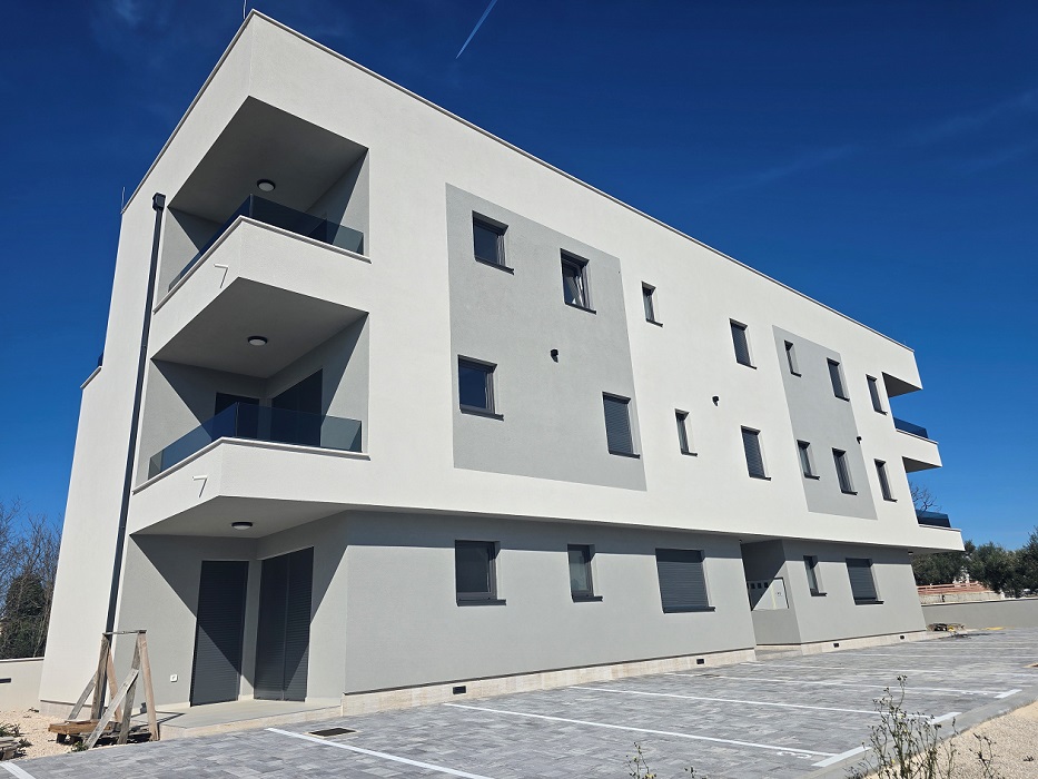 Zgrada sa ukupno šest stambenih jedinica, stanovima u prizemlju pripada dio vrta, dok stanovima na drugom katu pripada krovna terasa sa pogledom na more! Kvalitetna gradnja: pune AB ploče, zidana konstrukcija, termoblok 25+fasadni sustav debljine 8 cm. Stolarija PVC u antracit tonu, rolete+komarnici. Protupožarna/protuprovlana (Kolnoa) ulazna vrata u stanove. Postavljen kamen u stubište. Prvoklasni laminatni podovi i keramika u stanovima, podno grijanje u svim prostorijama (grijači kabel u estrihu). Klima uređaj u svakoj prostoriji.