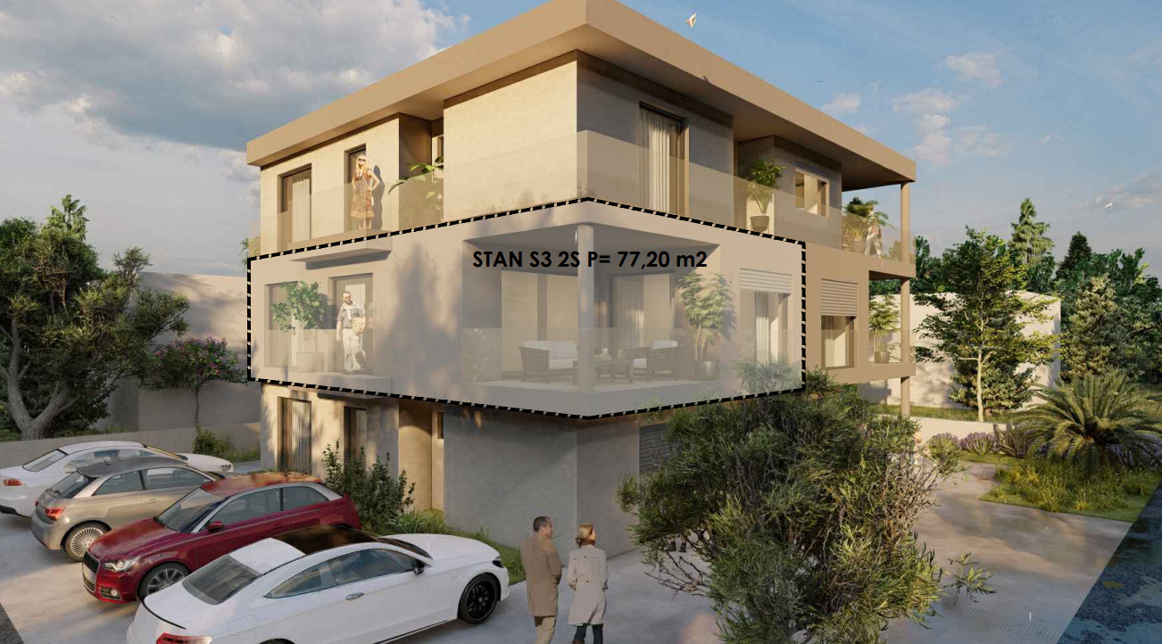 Stan je pažljivo osmišljen kako bi zadovoljio najviše standarde modernog stanovanja te se sastoji od reprezentativnog ulaznog prostora, prostranog i svijetlog dnevnog boravka povezanog s elegantnom blagovaonicom i suvremenom kuhinjom, hodnika, luksuzno opremljene kupaonice, dodatnog gostinjskog toaleta te dvije komforne spavaće sobe koje osiguravaju maksimalnu privatnost i udobnost. Posebnu vrijednost ovoj nekretnini daju natkrivena terasa, idealna za uživanje u mediteranskom ambijentu tijekom cijele godine, te dodatna nenatkrivena terasa koja pruža savršeno mjesto za opuštanje na otvorenom.